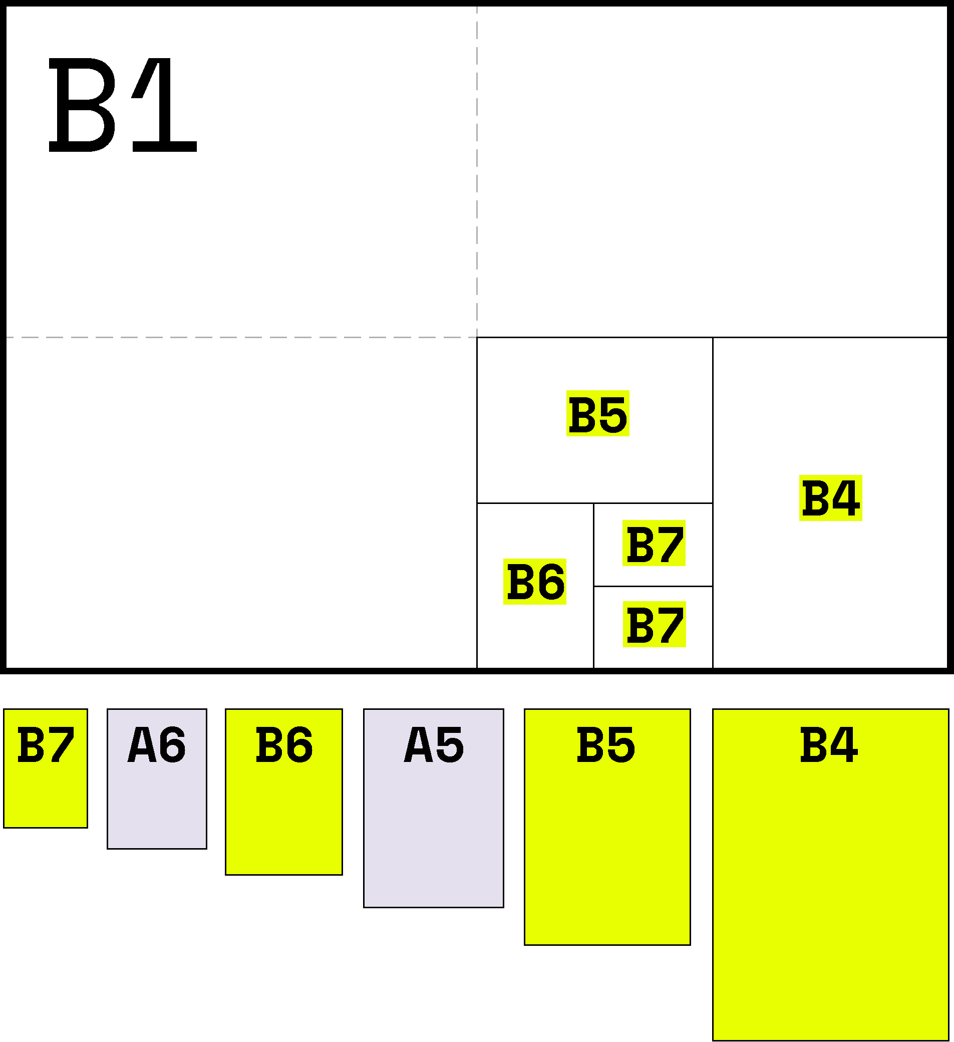Papiri se većinom kupuju u formatu B1(~100x70 cm), a zbog najbolje iskoristivosti, režu na: